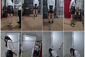 【皖北原创】新人雪雪小皮裙黑色小高跟,光腿、金属手铐脚镣体验