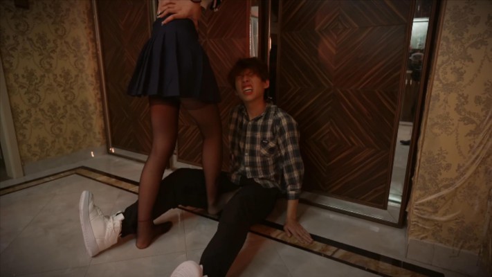 麦可颂终于不耐烦了,敬酒不吃吃罚酒!于是将他腿咚在墙下,并用膝盖顶裆部、高跟鞋碾踩裆部。接着麦可颂又将他拖到酒吧角落,暴力地踢裆、踩裆…….不知过去多久了,小奶狗也奄奄一息了,麦可颂让他从自己胯下来回地钻过去,羞辱着他…