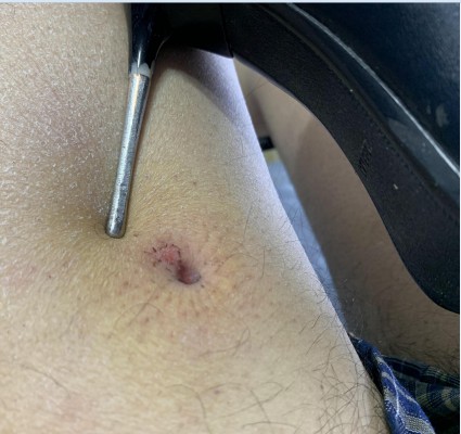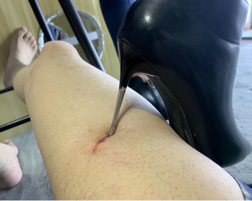 又一部稍狠的视频,细致打磨的靴子比煊赫门还要细!应要求在M的大腿上钻出两个血洞,鞋跟太过锋利,为了保证M不会骨裂只能用钻取的方式